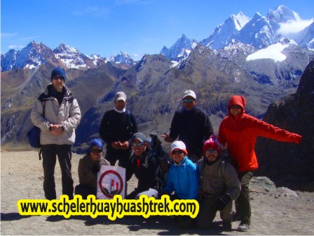 Se pasa el cuarto paso de Portachuelo de Huayhuash o Araraj 4750 m. Se observa los nevados de Carnicero, Jurau, Trapecio, Puscanturpas, Cuyoc, Millpo, y parte de la Cordillera Raura, se |