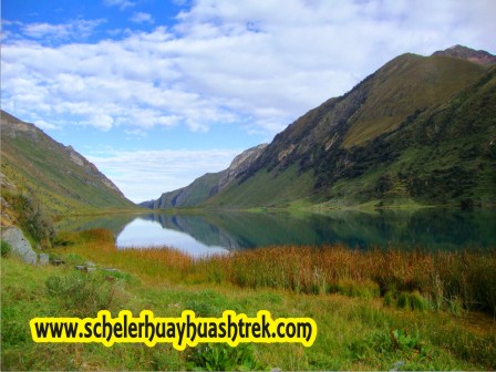 Se bordea la laguna de Jahuacocha por su orilla norte, después se  asciende hacia el segundo paso de Sambunya 4800 m.
