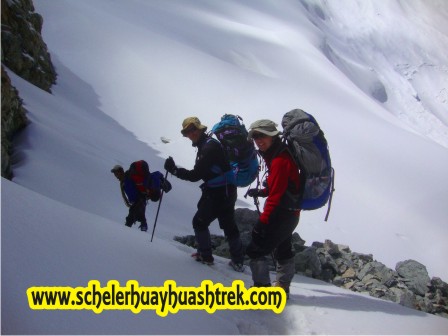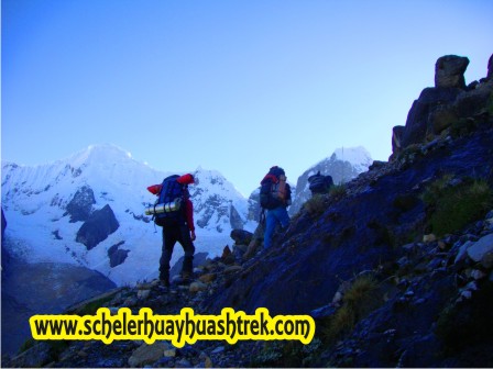 El camino va en descenso para luego subir al paso de Trapecio, desde donde se tiene vista del nevado Trapecio y los Puscanturpas, descenso por un camino casi mascado hasta el campamento de Huayhuash.