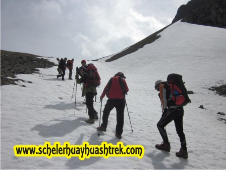El camino va en descenso para luego subir al paso de Trapecio, desde donde se tiene vista del nevado Trapecio y los Puscanturpas, descenso por un camino casi mascado hasta el campamento de Huayhuash.